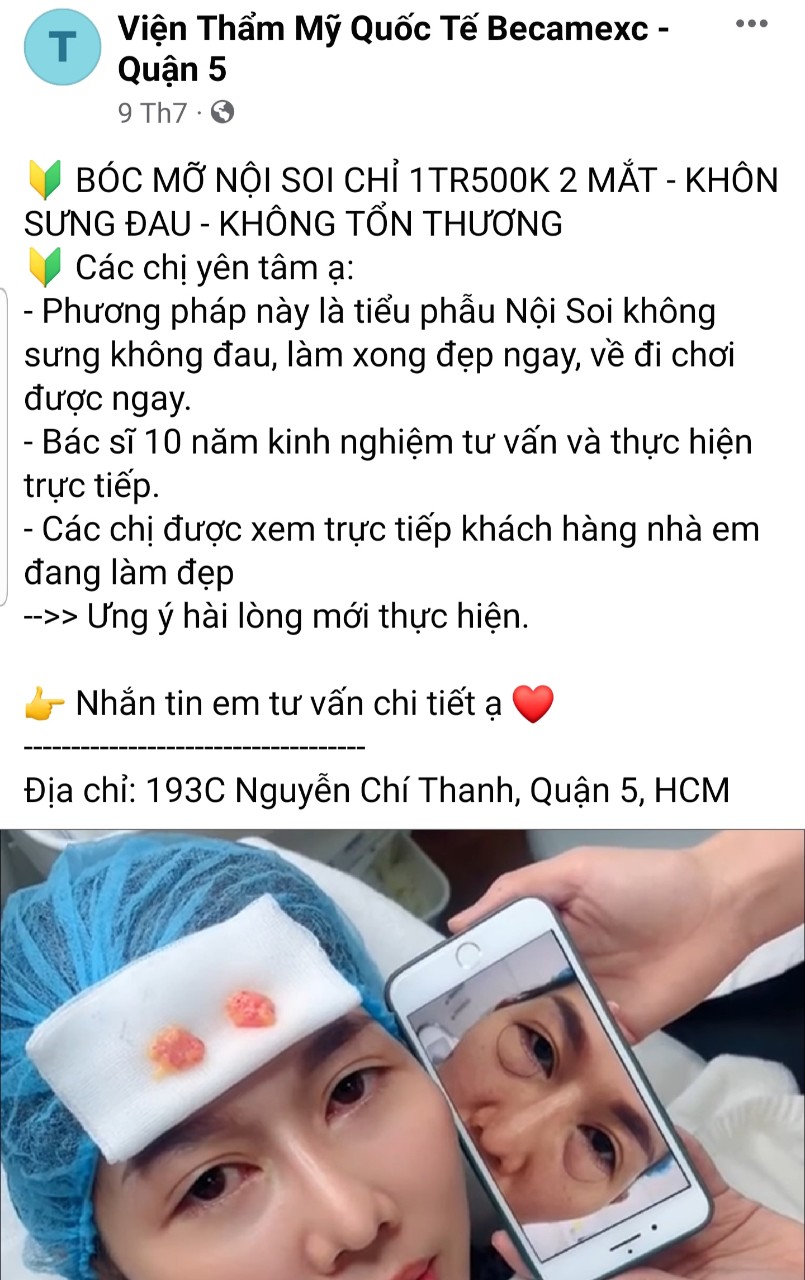 Một bài quảng cáo về dịch vụ bóc mỡ mắt tại Viện thẩm mỹ Quốc tế Becamexc trên facebook
