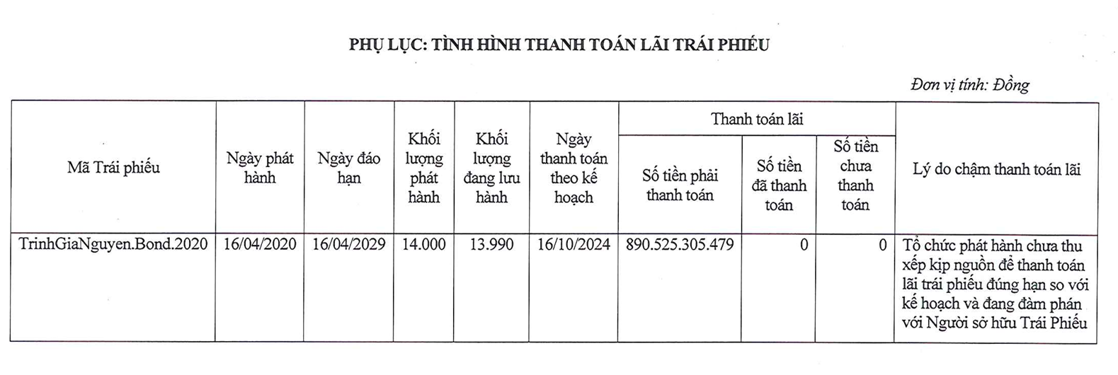 Tuy nhiên, Viễn thông Trịnh Gia Nguyễn không thể thanh toán đúng hạn. Về lý do chậm thanh toán, công ty cho biết, tổ chức phát hành chưa thu xếp kịp nguồn để thanh toán lãi trái phiếu đúng hạn so với kế hoạch và đang đàm phán với người sở hữu trái phiếu.