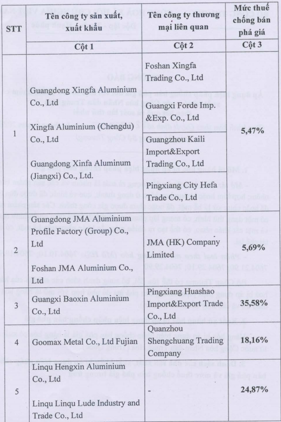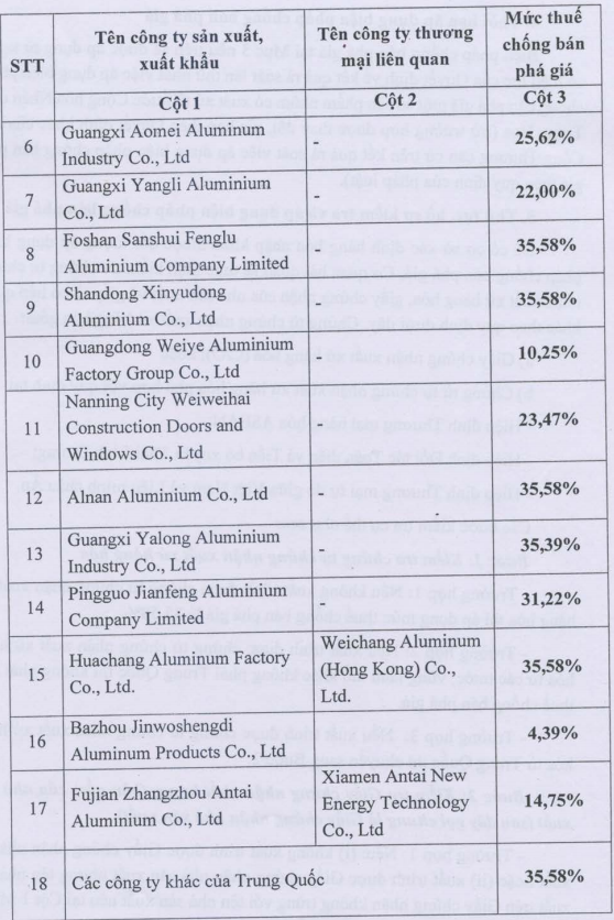 Theo đó, mức thuế CBPG tạm thời được áp dụng cho các doanh nghiệp xuất khẩu nhôm thanh đùn ép của Trung Quốc là từ 2,49% đến 35,58%. Số lượng nhà sản xuất Trung Quốc bị điều tra trong vụ việc là 16 công ty.