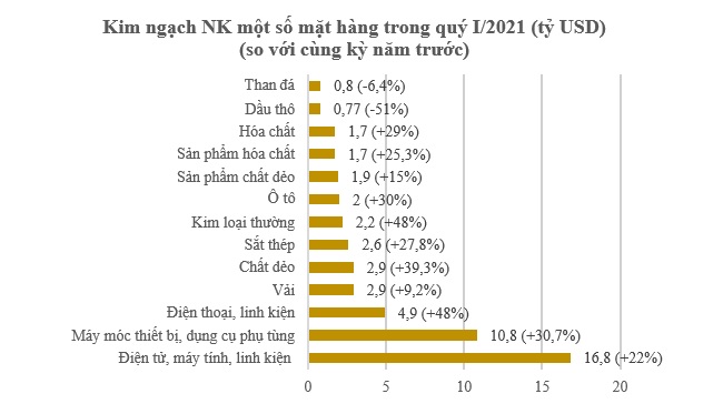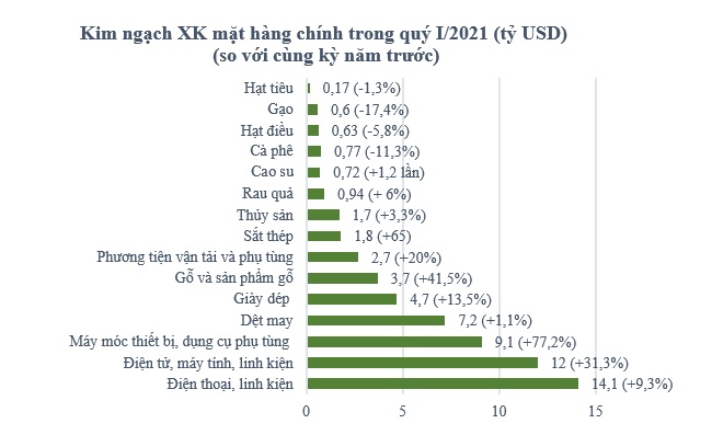 Tổng kim ngạch xuất nhập khẩu trong quý I/2021, cả nước có 11 mặt hàng đạt kim ngạch xuất khẩu trên 1 tỷ USD, chiếm 23,7% tổng kim ngạch xuất khẩu