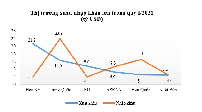 Xét theo quy mô thị trường, xuất khẩu của Việt Nam sang Hoa Kỳ quý đầu năm nay tăng 32,8% so với cùng kỳ năm trước, đây là thị trường xuất khẩu lớn nhất của Việt Nam. Thị trường Trung Quốc tăng 34,3%; EU tăng 14,2%; ASEAN tăng 3,4%; Hàn Quốc tăng 6,4%; Nhật Bản giảm 1,5%.
