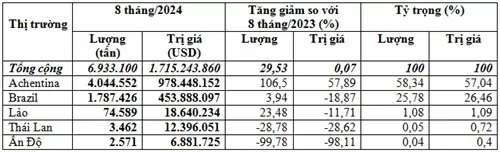 Argentina là thị trường lớn nhất cung cấp ngô cho Việt Nam trong 8 tháng đầu năm 2024, chiếm 58,3% trong tổng lượng và chiếm 57% trong tổng kim ngạch nhập khẩu ngô của cả nước, đạt trên 4,04 triệu tấn, tương đương gần 978,45 triệu USD, giá 241,9 USD/tấn, tăng 106,5% về lượng, tăng 57,9% kim ngạch nhưng giảm 23,5% về giá so với 8 tháng đầu năm 2023.