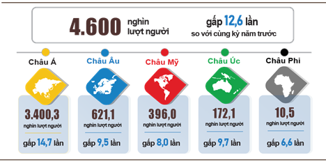 Tính chung 5 tháng đầu năm 2023, khách quốc tế đến nước ta ước đạt gần 4,6 triệu lượt người, gấp 12,6 lần cùng kỳ năm trước nhưng vẫn chỉ bằng 63% so với cùng kỳ năm 2019 - năm chưa xảy ra dịch Covid-19.