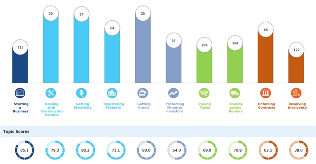 Điểm số và vị trí xếp hạng của của Việt Nam với 10 tiêu chí: Thành lập doanh nghiệp, Xin giấy phép xây dựng, Tiếp cận điện năng, Đăng ký tài sản, Vay vốn, Bảo vệ lợi ích nhà đầu tư thiểu số, Nộp thuế, Giao thương quốc tế, Thực thi hợp đồng và Xử lý khi mất khả năng thanh toán.