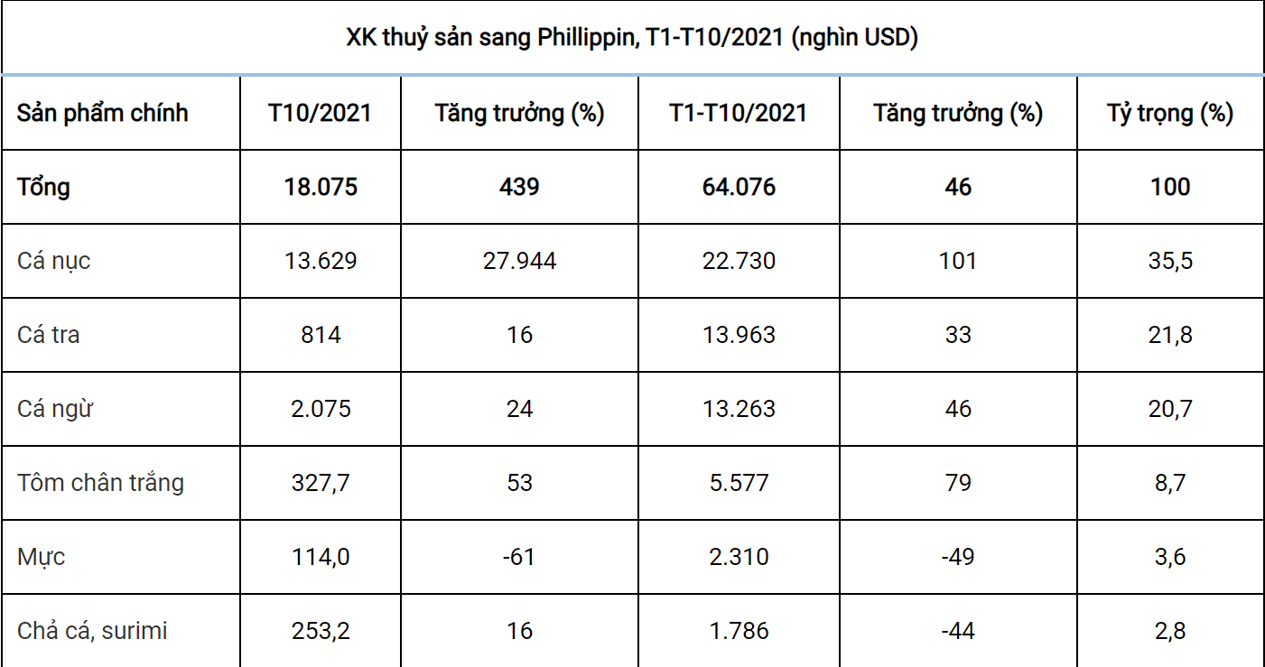 Theo thông tin từ Hiệp hội Chế biến và Xuất khẩu Thuỷ sản Việt Nam (VASEP), xuất khẩu thuỷ sản của Việt Nam sang Phillipines tăng gấp 5 lần trong tháng 10/2021.
