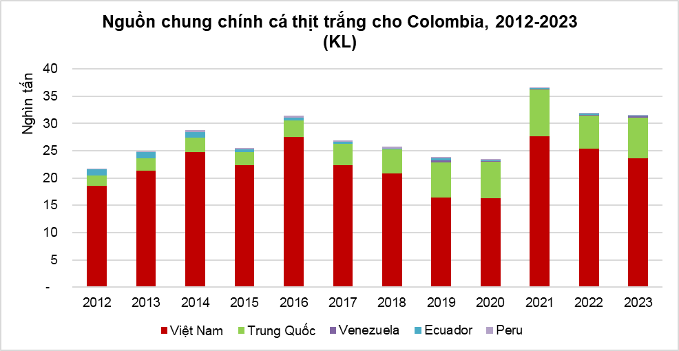 Theo số liệu của ITC, Colombia chủ yếu tiêu thụ các sản phẩm cá tra đông lạnh mã HS 030424, cá rô phi đông lạnh mã HS 030461, phile cá tra đông lạnh mã HS 030462,...Năm 2023, quốc gia Nam Mỹ này tiêu thụ gần 50 triệu USD cá thịt trắng, trong đó khối lượng NK từ Việt Nam (chủ yếu là cá tra) đạt gần 24 nghìn tấn, trị giá đạt hơn 33 triệu USD, chiếm 66% tỷ trọng. Đứng sau Việt Nam, Trung Quốc, Ecuador, Peru, Venezuela cũng là các nguồn cung cá thịt trắng nhiều nhất cho thị trường Colombia.
