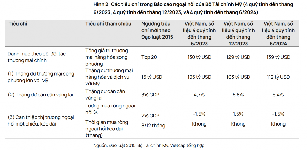Mới đây, Công ty Cổ phần Chứng khoán Vietcap đã có báo cáo, Việt Nam vừa vượt qua hai trong ba tiêu chí của Đạo luật Xúc tiến và Thực thi Thương mại năm 2015 của Mỹ, bao gồm thặng dư thương mại song phương đáng kể với Mỹ và thặng dư cán cân vãng lai cao.
