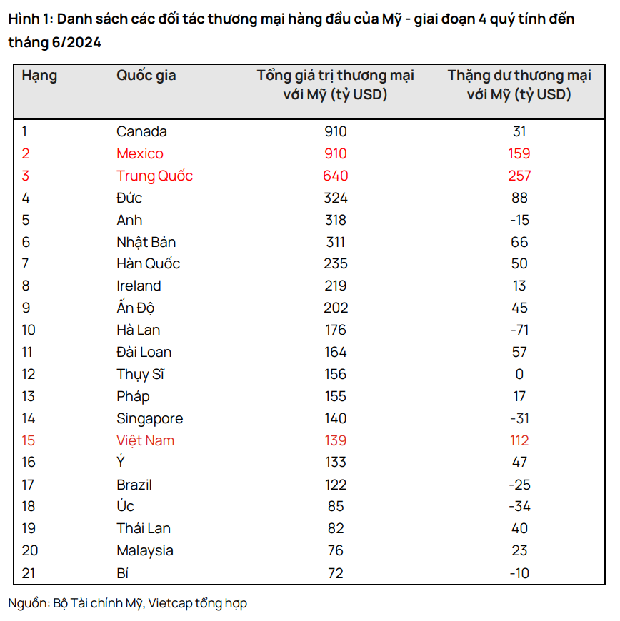 Danh sách các đối tác thương mại hàng đầu của Mỹ - Giai đoạn 4 quý tính đến tháng 6/2024. Nguồn: Bộ Tài chính Mỹ, Vietcap tổng hợp.