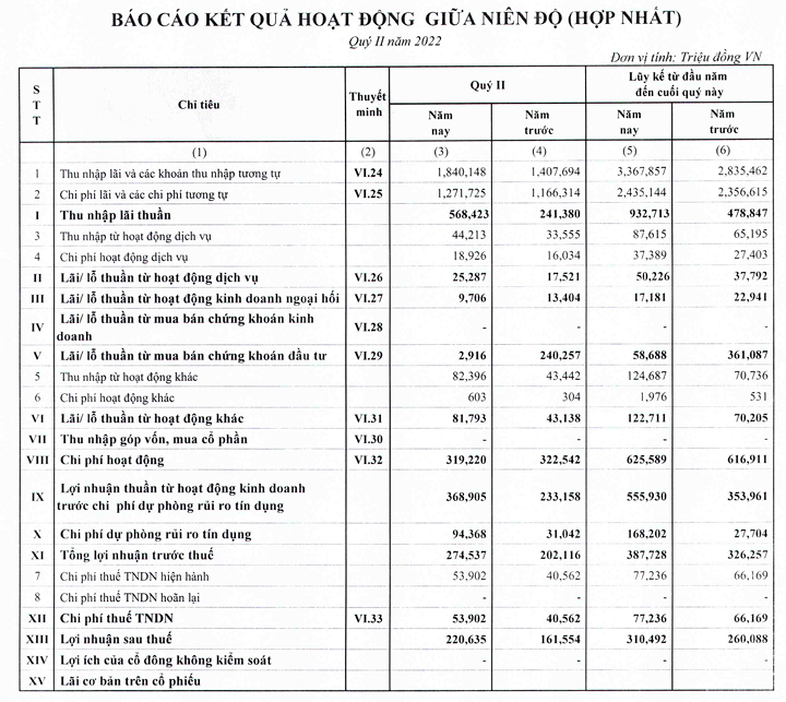 Về tình hình kinh doanh, theo BCTC quý 2 vừa công bố, lợi nhuận sau thuế đạt 220 tỷ đồng, tăng 36% lần so với cùng kỳ. Trong đó, thu nhập lãi thuần đạt 568,4 tỷ đồng, tăng 135% lần so với cùng kỳ.