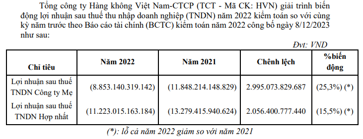 Nguồn: giải trình về kết quả kiểm toán năm 2022 của HVN