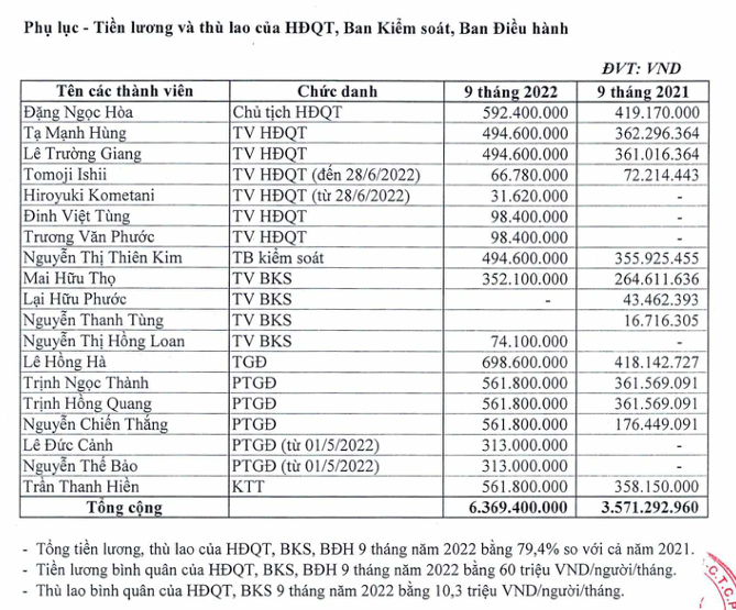 3 Phó tổng giám đốc là Trịnh Ngọc Thành, Trịnh Hồng Quang, Nguyễn Chiến Thắng và Kế toán trưởng Trần Thanh Hiền cũng nhận mức lương trung bình trên 62 triệu đồng/tháng.