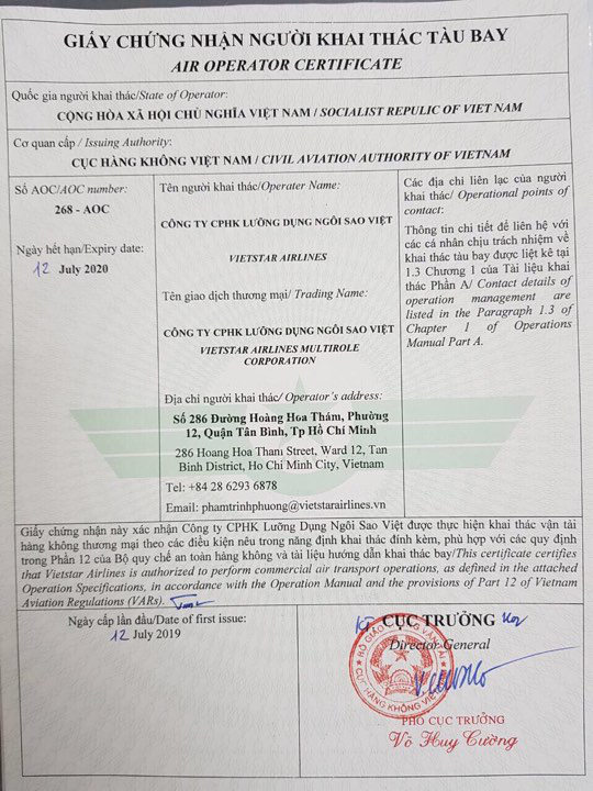| Giấy chứng nhận khai thác tàu bay của Vietstar Airlines. Ảnh: VOV |