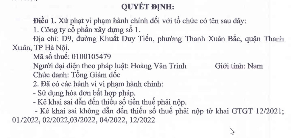 Cục thuế TP Hà Nội cho biết CTCP Xây dựng Số 1 (Vinaconex 1, HNX: VC1) bị phạt vì loạt hành vi vi phạm hành chính như sử dụng hóa đơn bất hợp pháp; kê khai sai dẫn đến thiếu số tiền thuế phải nộp; kê khai sai không dẫn đến thiếu số thuế phải nộp tờ khai giá trị gia tăng (GTGT)...