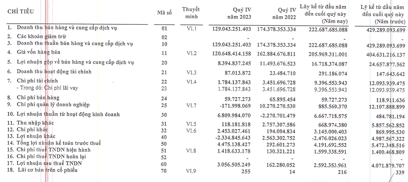 Về tình hình kinh doanh, luỹ kế năm 2023, công ty ghi nhận doanh thu thuần đạt 222 tỷ đồng và lợi nhuận sau thuế đạt hơn 2,5 tỷ đồng, lần lượt giảm 48% và 37,5% so với cùng kỳ. Với quý I/2023 kinh doanh lợi nhuận èo uột, hai quý tiếp theo lỗ liên tiếp thì kết quả kinh doanh quý IV/2023 đã kéo lại kết quả kinh doanh cả năm của công ty.