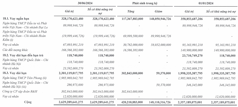 Trong nửa đầu năm 2024, Vinahud cũng phát sinh khoản vay dài hạn gần 303 tỷ đồng với R&H Group nhưng không có thuyết minh cụ thể.