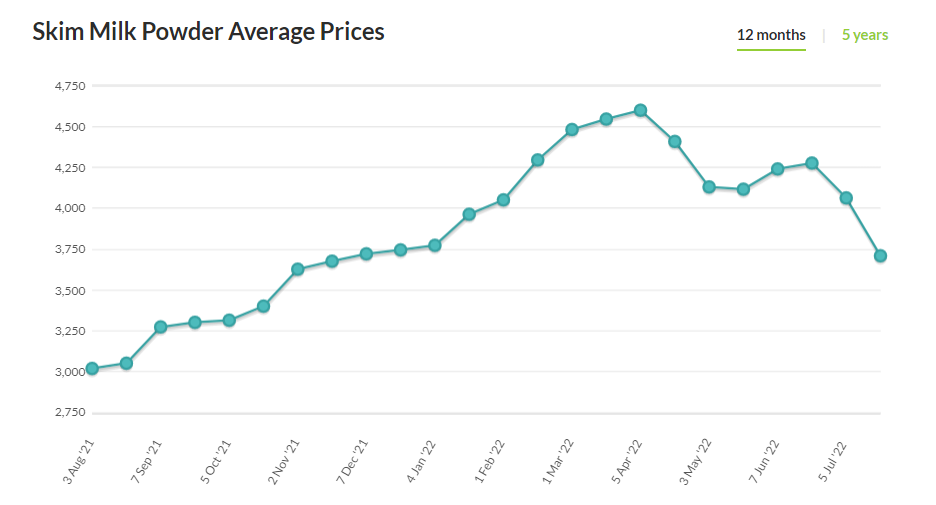 Giá sữa bột gầy có xu hướng giảm sau khi tạo đỉnh từ tháng 4/2022. Ảnh: Global Dairy Trade