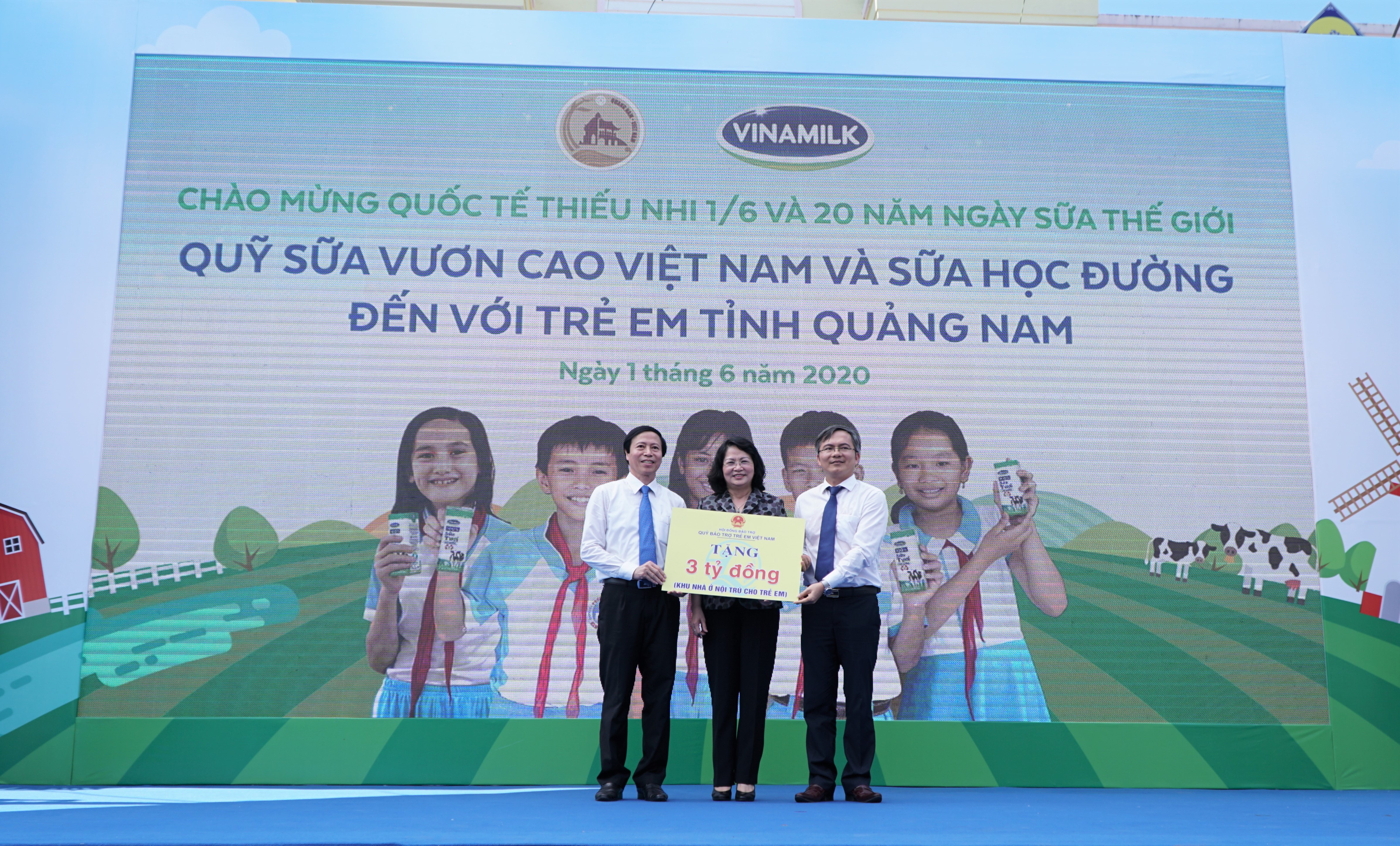 Nhân ngày Quốc tế thiếu nhi và hưởng ứng 20 năm Ngày sữa thế giới - 1/06/2020, Công ty cổ phần Sữa Việt Nam (Vinamilk) đồng hành cùng tỉnh Quảng Nam mang đến niềm vui uống sữa cho hơn 34.000 trẻ em thông qua Quỹ sữa Vươn cao Việt Nam và chương trình Sữa học đường. Đặc biệt, để hưởng ứng chủ đề #EnjoyDairy của Ngày sữa thế giới 2020 được phát động trên toàn cầu, một ngày hội đã được tổ chức với thông điệp “Vì niềm vui uống sữa tại trường” và mang đến những món quà ý nghĩa cho trẻ em của tỉnh Quảng Nam.