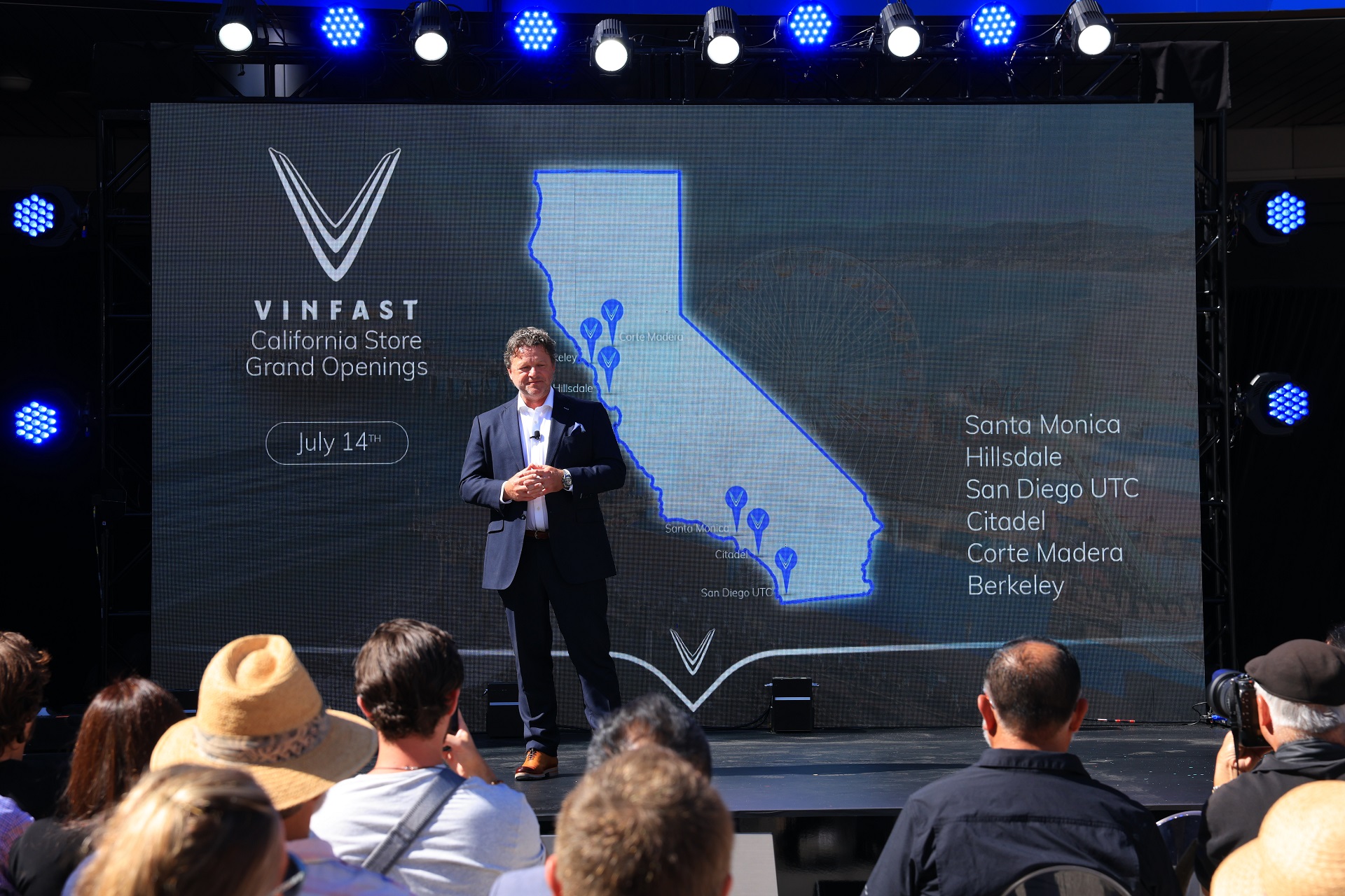 Ông Craig Westbrook - Giám đốc Dịch vụ VinFast Mỹ giới thiệu về 6 VinFast Store đồng loạt khai trương trong hôm nay tại California, Mỹ.