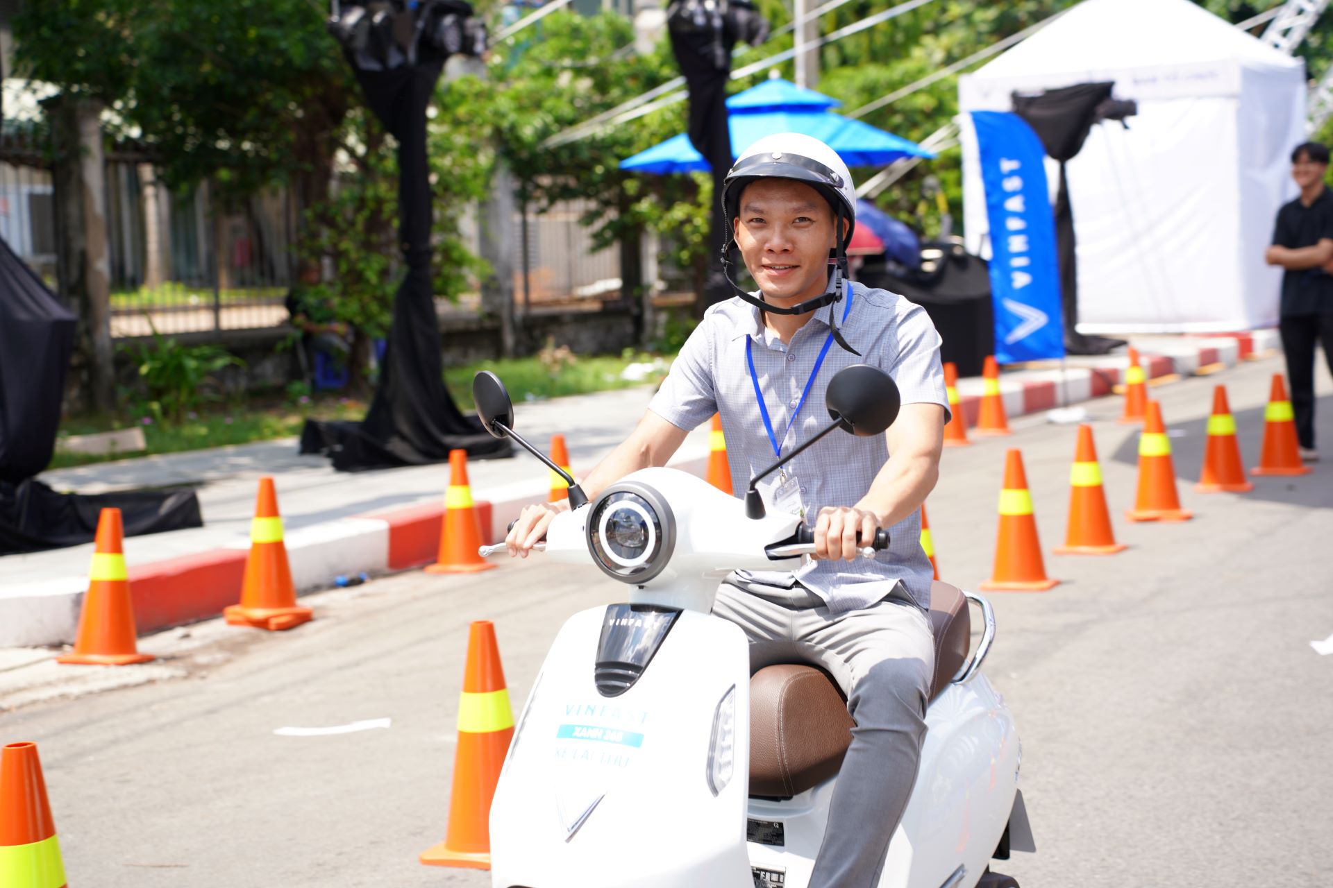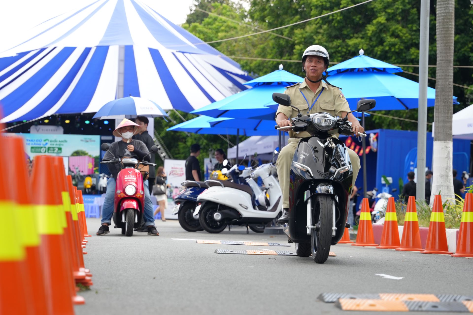 Hàng trăm khách tham dự đã hào hứng đăng ký trải nghiệm thực tế các mẫu xe máy điện mới nhất của VinFast như Evo Neo, Feliz Neo, Motio… tạo nên không khí vô cùng náo nhiệt. Đặc biệt, khu vực lái thử thiết kế mô phỏng đường chạy zigzag với gờ giảm tốc giúp người dùng cảm nhận trọn vẹn khả năng vận hành ổn định, linh hoạt của xe điện VinFast trong điều kiện thực tế.