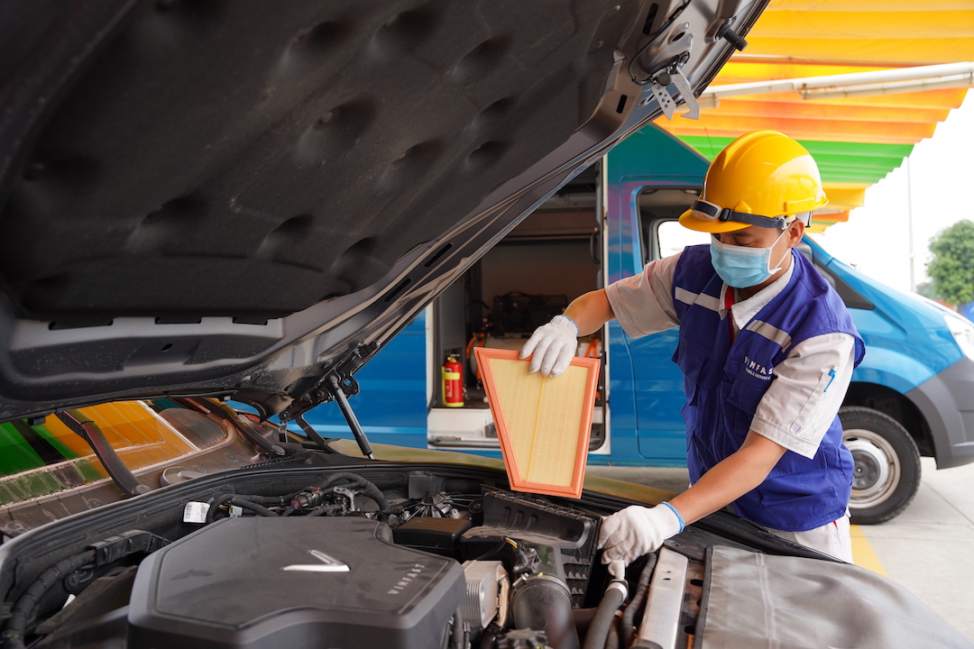 Kỹ thuật viên Mobile Service đang thực hiện thay lọc gió cho xe VinFast Lux A2.0