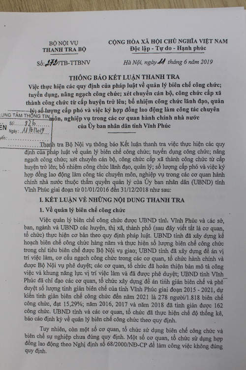Thanh tra Bộ Nội vụ đã phát hiện và yêu cầu kiểm điểm, làm rõ trách nhiệm vi phạm trong công tác bổ nhiệm, quản lý công chức (giai đoạn 2016 - 2018) tại tỉnh Vĩnh Phúc. Thanh tra công tác quản lý biên chế công chức tại tỉnh Vĩnh Phúc, Thanh tra Bộ Nội vụ kết luận, một số cơ quan, tổ chức sử dụng biên chế công chức và biên chế sự nghiệp chưa đúng quy định. Một số cơ quan, tổ chức sử dụng hợp đồng lao động theo Nghị định số 68/2000/NĐ-CP để làm công việc không đúng quy định.