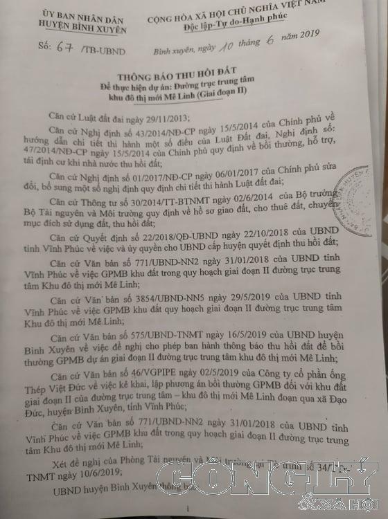 Thông báo thu hồi đất số 67/TB-UBND do ông Nguyễn Tuấn Hải, Phó Chủ tịch UBND huyện Bình Xuyên ký ngày 10/6/2019 có nội dung: Thu hồi tổng diện tích 20.790,6m2bao gồm đất nông nghiệp, đất phi nông nghiệp, đất chưa sử dụng của các hộ gia đình, cá nhân và tổ chức quản lý sử dụng tại xã Đạo Đức... để thực hiện dự án đường trục trung tâm khu đô thị mới Mê Linh (Giai đoạn II), tên thường gọi là đường 100.