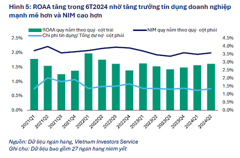 Báo cáo của VIS Rating chỉ ra trong 6 tháng đầu năm, tỷ lệ nợ có vấn đề của ngành vẫn giữ ổn định so với quý trước ở mức 2,2%, các ngân hàng nhỏ suy giảm chất lượng tài sản nhiều nhất. Tỷ suất lợi nhuận trên tổng tài sản bình quân (ROAA) của các ngân hàng tăng nhẹ lên 1,6% trong 6 tháng đầu năm từ mức 1,5% trong năm 2023, nhờ tăng trưởng tín dụng doanh nghiệp mạnh mẽ hơn và biên lãi ròng (NIM) cao hơn.