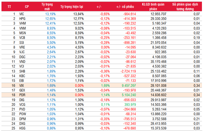 Dựa trên số liệu cập nhật ngày 21/08, SSI Research dự báo VIX và PDR có thể được thêm vào chỉ số FTSE Vietnam Index do thỏa mãn tất cả các điều kiện. Ngoài ra, sẽ không có cổ phiếu nào bị loại ra. Theo đó, danh mục chỉ số sẽ bao gồm 25 cổ phiếu.