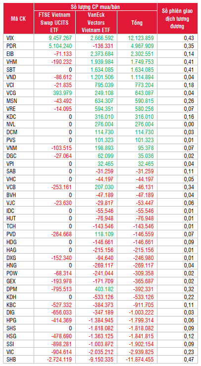 Ở chiều ngược lại, SHB sẽ là cổ phiếu bị bán ra nhiều nhất với số lượng dự kiến lên đến 11,8 triệu đơn vị. Các mã cũng sẽ bị bán mạnh bao gồm: VIC (2,9 triệu đơn vị), SSI (1,9 triệu đơn vị), HSG (1,8 triệu đơn vị), SHS (1,8 triệu đơn vị), HPG (1,8 triệu đơn vị), DIG (1 triệu đơn vị).