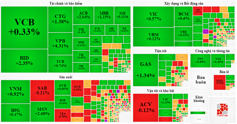 Trong đó, góp phần lớn vẫn là nhóm cổ phiếu Blue-chips như BID tăng 2,35%, VPB tăng 4,31%, MSN tăng 2,68%, GAS tăng 1,34%, CTG tăng 1,38%...