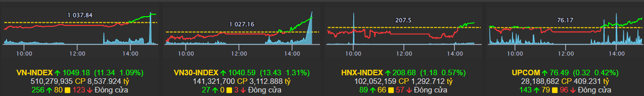 Kết phiên, VN-Index tăng 11.34 điểm (+1.09%), đạt 1,049.18 điểm; HNX-Index tăng 1.18 điểm (+0.57%), đạt 206.68 điểm. UpCOM-Index tăng 0,32 điểm lên 76,49 điểm. Thanh khoản trên HoSE được cải thiện, tăng 11% so với phiên trước với giá trị khớp lệnh đạt 7.819 tỷ đồng.