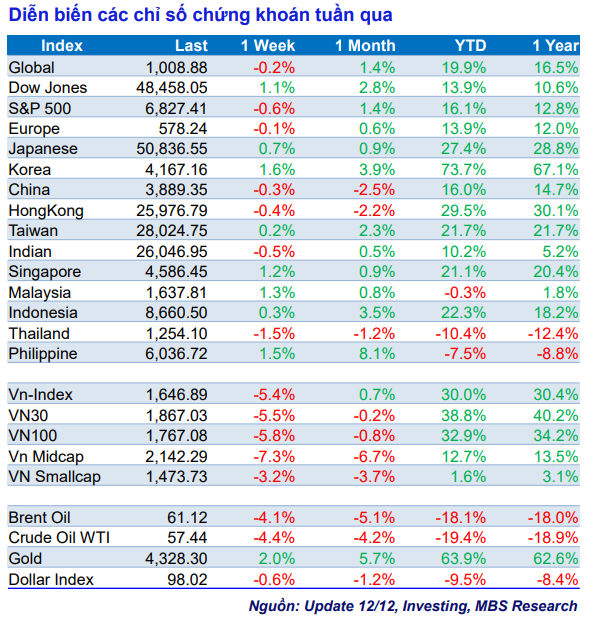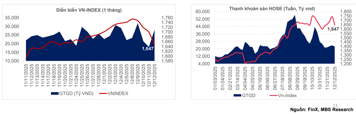 Trong nước, thị trường chứng khoán Việt Nam vừa trải qua tuần giảm mạnh nhất kể từ đáy tháng 4/2025. VN-Index đóng cửa tại 1.646,89 điểm, giảm 94,43 điểm, tương đương 5,42% so với tuần trước, qua đó lấy đi tới 62% thành quả của chuỗi 4 tuần tăng liên tiếp trước đó. Biên độ dao động trong tuần lên tới hơn 130 điểm, cho thấy trạng thái tâm lý hoảng loạn ngắn hạn của nhà đầu tư khi thanh khoản suy giảm.