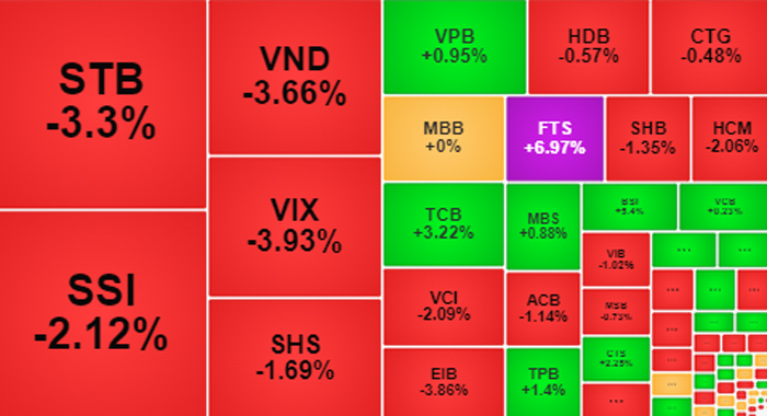 Nhóm cổ phiếu có mức giảm đáng kể nhất trong phiên hôm nay chính là nhóm chứng khoán. Đây là nguyên nhân chính gây ra áp lực bán lớn cho thị trường chung. Rất nhiều cổ phiếu lớn trong nhóm đồng loạt giảm mạnh dù cho đã tăng điểm khá tốt trước đó. Một số cái tên đáng chú ý có thể kể đến như VIX (-3.93%), VND (-3.66%) hay SSI (-2.12%).