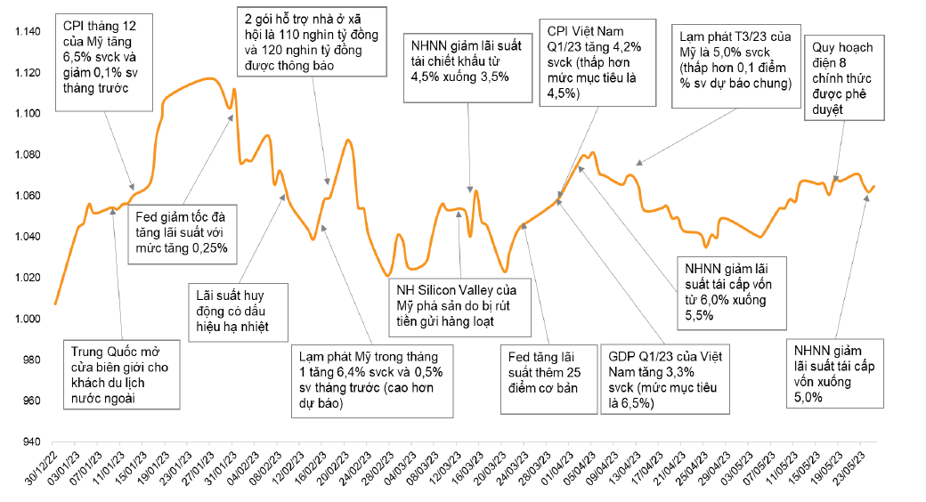 Theo báo cáo "La bàn đầu tư tháng 6" của Chứng khoán VNDirect, tính đến ngày 25/05/2023, VN-INDEX chốt tại mức 1.064,6 điểm, tăng 1,5% so với đầu tháng và 5,7% kể từ đầu năm. Hiện tại, chỉ số VN-INDEX đang giao dịch tại mức 0,8 lần P/E trung bình 5 năm và 0,7 lần P/B trung bình 5 năm.