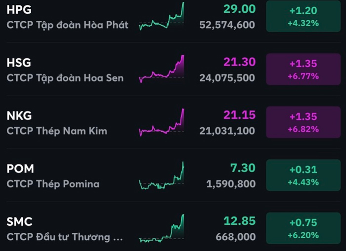 Không chỉ tăng giá mạnh, nhóm cổ phiếu thép cũng giao dịch sôi nổi, với HPG khớp lệnh 52,5 triệu đơn vị, HSG khớp lệnh 24 triệu đơn vị, NKG khớp lệnh 21 triệu đơn vị.