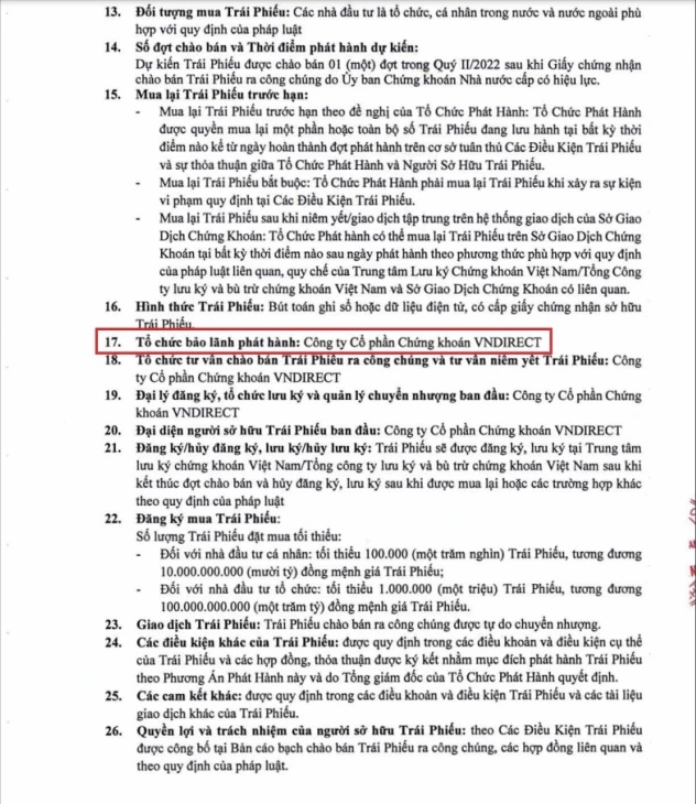 Đáng chú ý, lô trái phiếu nghìn tỷ này được bảo lãnh phát hành bởi Công ty Chứng khoán VnDirect (Mã CK: VND). Được biết, đây là loại không chuyển đổi, không kèm chứng quyền và không có tài sản đảm bảo. Kỳ hạn trái phiếu là 36 tháng kể từ ngày phát hành.