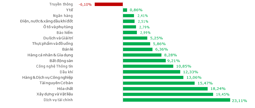 Ngược lại với diễn biến của tháng 10, hầu hết các nhóm ngành trong tháng 11 đều có sự tăng giá ngoại trừ nhóm Truyền thông. Nổi bật nhất là ngành Chứng khoán, Vật liệu xây dựng, Hóa chất và Tài nguyên cơ bản.