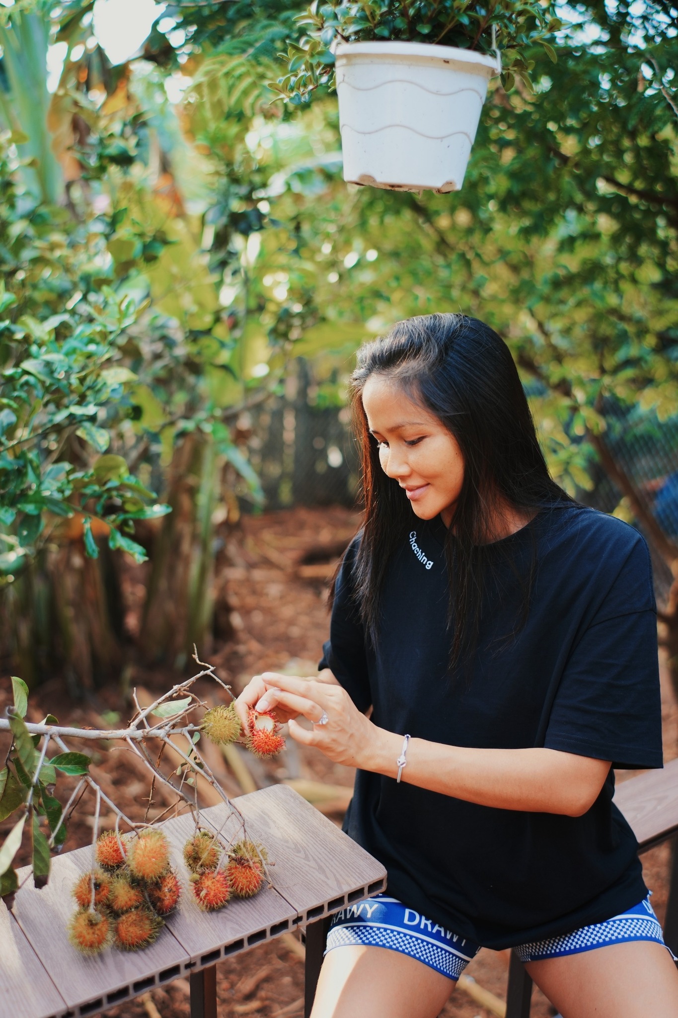 Trong hình, vợ chồng H'Hen Niê diện trang phục giản dị với áo phông, quần đùi. Hoa hậu hoàn vũ Việt Nam tự tin khoe mặt mộc ở những tháng cuối thai kì. Nhìn những hình ảnh của Hen nhiều người không nghĩ đây là một hoa hậu vì quá đỗi chân chất, bình dị, không phấn son, quần áo hàng hiệu như nhiều mỹ nhân đình đám khác.