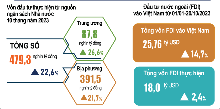 Tính đến ngày 20/10/2023, vốn đăng ký cấp mới, vốn đăng ký điều chỉnh và giá trị góp vốn, mua cổ phần của nhà đầu tư nước ngoài đạt gần 25,76 tỷ USD, tăng 14,7% so với cùng kỳ năm trước. Với sự chỉ đạo quyết liệt của Chính phủ, Thủ tướng Chính phủ, các Bộ, ngành và địa phương nỗ lực tập trung đẩy mạnh triển khai thực hiện nguồn vốn đầu tư từ ngân sách Nhà nước vào các tháng cuối năm.