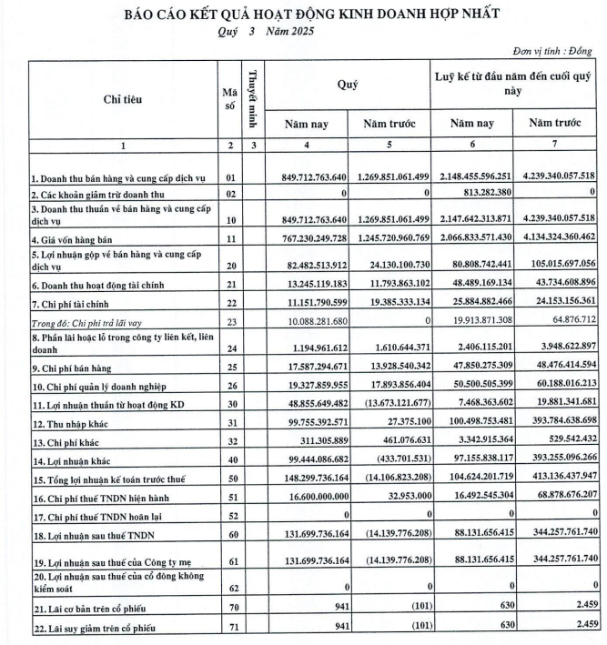Dù kết quả quý III khả quan, Vosco vẫn chưa thể xoay chuyển tình thế. Lũy kế 9 tháng đầu năm 2025, doanh thu của doanh nghiệp chỉ đạt 2.147 tỷ đồng, giảm gần một nửa so với cùng kỳ; lợi nhuận sau thuế đạt 88 tỷ đồng, chỉ bằng một phần tư kết quả năm trước.