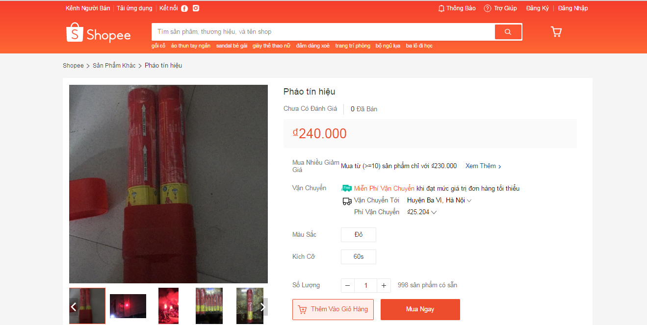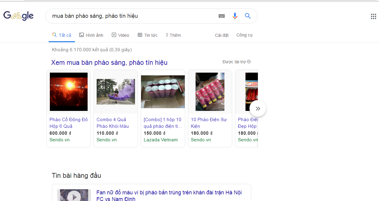 Đầu tiên, thử “hỏi giáo sư google” – công cụ tìm kiếm mà người Việt thường xuyên sử dụng. Chỉ trong vòng chưa đầy 0,32 giây, với cụm từ tìm kiếm “mua bán pháo sáng, pháo tín hiệu” cho ra tới 6.170.000 kết quả. Quá nhiều các trang bán hàng cung cấp dịch vụ từ A đến Z, chỉ cần số tiền vài trăm nghìn và mấy nút kích chuột, bất kỳ ai không phân biệt lớn bé, già trẻ, chẳng phân biệt giới tính đều có thể sở hữu riêng cho mình mà không hề hạn chế số lượng.