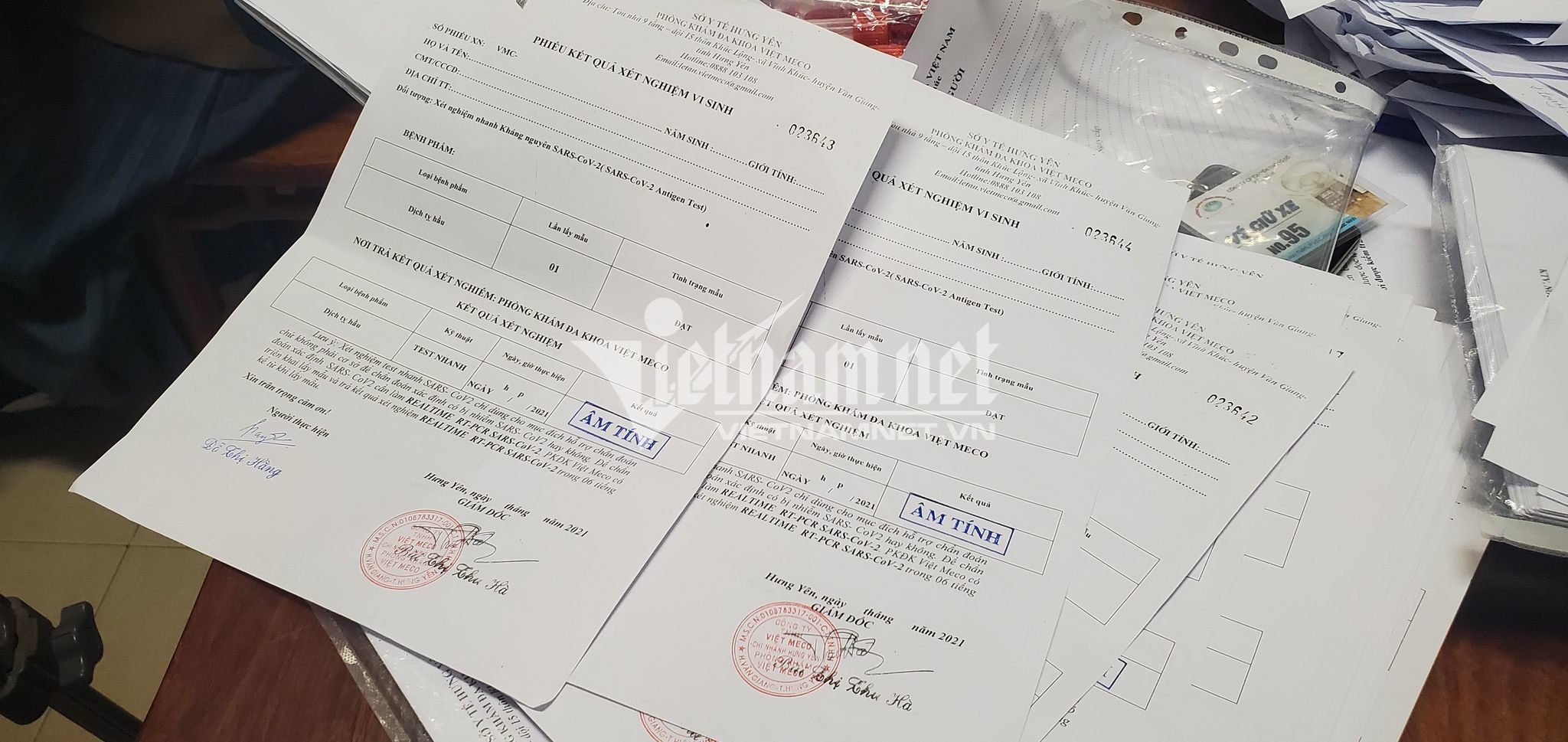 Đáng chú ý, các phiếu trả kết quả xét nghiệm ghi đơn vị là Phòng khám đa khoa Việt Meco được điền sẵn tình trạng bệnh phẩm và kết quả xét nghiệm âm tính. Mặc dù địa điểm lấy mẫu xét nghiệm ở Hà Nội, tuy nhiên ở phần cuối giấy trả kết quả xét nghiệm lại ghi địa điểm là "Hưng Yên, ngày...".