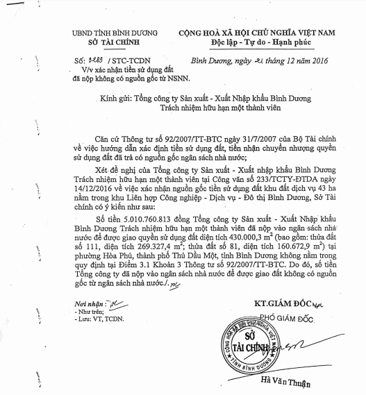 Tiền nộp thuế đất không có nguồn gốc từ Ngân sách Ngày 14/12/2016, TCT Bình Dương có văn bản gửi Sở Tài chính Bình Dương để nghị xác nhận nguồn gốc tiền sử dụng đất khu đất dịch vụ 43 ha nằm trong Khu liên hợp công nghiệp, dịch vụ, đô thị Bình Dương. Theo TCT Bình Dương, công ty đã vay vốn từ ngân hàng và các đơn vị khác để thực hiện thanh toán hợp đồng đền bù, giải phóng mặt bằng đất đai và đóng tiền sử dụng đất vào ngân sách nhà nước để được giao đất… Phúc đáp lại văn bản trên, ngày 21/12/2016, Sở Tài chính Bình Dương có văn bản số 3289/STC-TCDN xác nhận: “Số tiền hơn 5 tỷ đồng do TCT Bình Dương nộp vào NSNN để được giao quyền sử dụng 43ha đất tại phường Hòa Phú, TP Thủ Dầu Một không có nguồn gốc từ NSNN”.