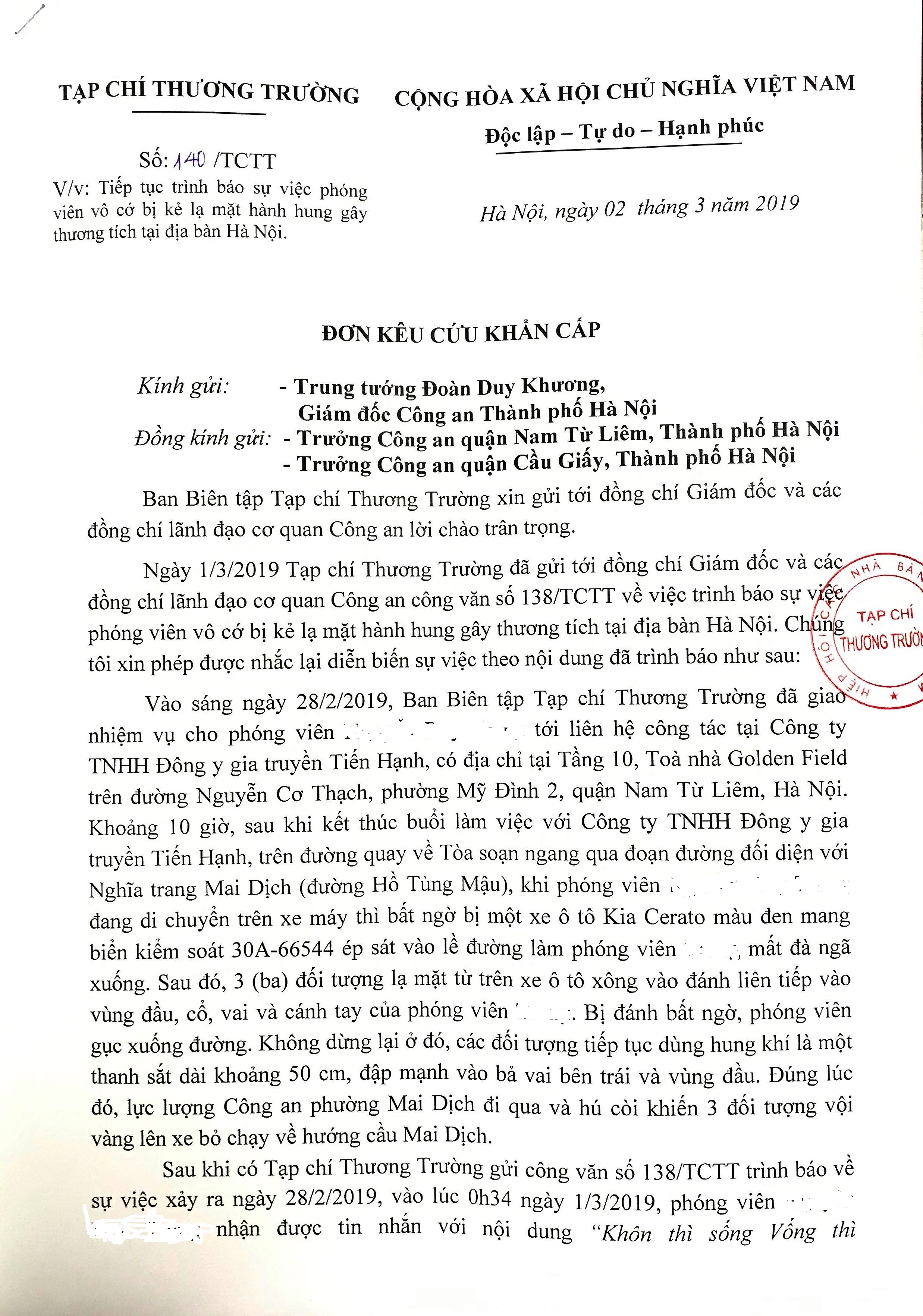 Tạp chí Thương trường gửi công văn tiếp tục trình báo vụ 3 đối tượng hành hung PV và nhắn tin đe dọa PV và Lãnh đạo báo. |