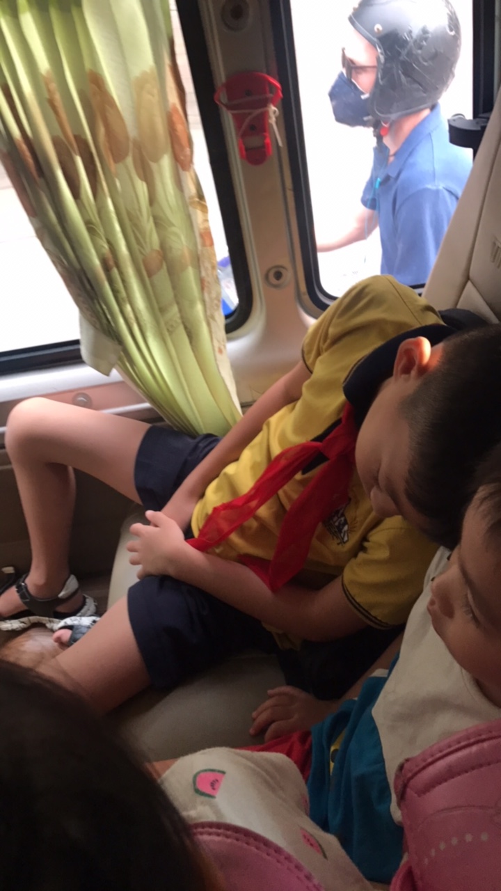 Ngồi trên xe đưa đón học sinh của con mình, suốt chặng đường từ Đốc Ngữ, đến Đội Cấn qua Đường Bưởi và điểm đến là trường Tiểu học và Trung học Cơ sở Everest nằm trên đường Hoàng Quốc Việt. Trên xe chị quan sát thấy rằng có tới 50% các con đều ngủ trên xe, nhất là các bạn lên xe từ những điểm đón đầu tiên theo lịch trình. Còn cô phụ xe (Cô Monitor) đều rất bận rộn vì mỗi điểm đến đều phải xuống xe để đón học sinh lên xe.