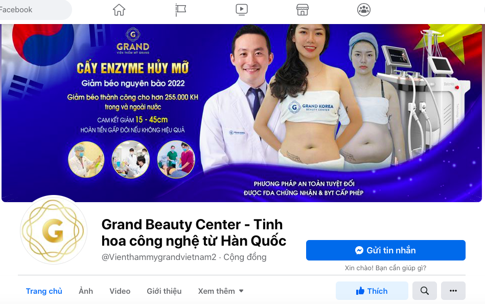 Ngoài ra, trên mạng xã hội Facebook cũng có một tài khoản tên "Grand Beauty Center - Tinh hoa công nghệ từ Hàn Quốc" (https://www.facebook.com/Vienthammygrandvietnam2/) vẫn còn nhiều bài đăng quảng cáo về các dịch vụ của Viện Thẩm mỹ Grand với những lời "có cánh" như: VTM Quốc Tế Grand Việt Nam chi nhánh đầu tiên của Tập Đoàn Dược Grand Hàn Quốc - Đơn vị có 15 năm kinh nghiệm trong lĩnh vực giảm béo và trẻ hoá không xâm lấn.