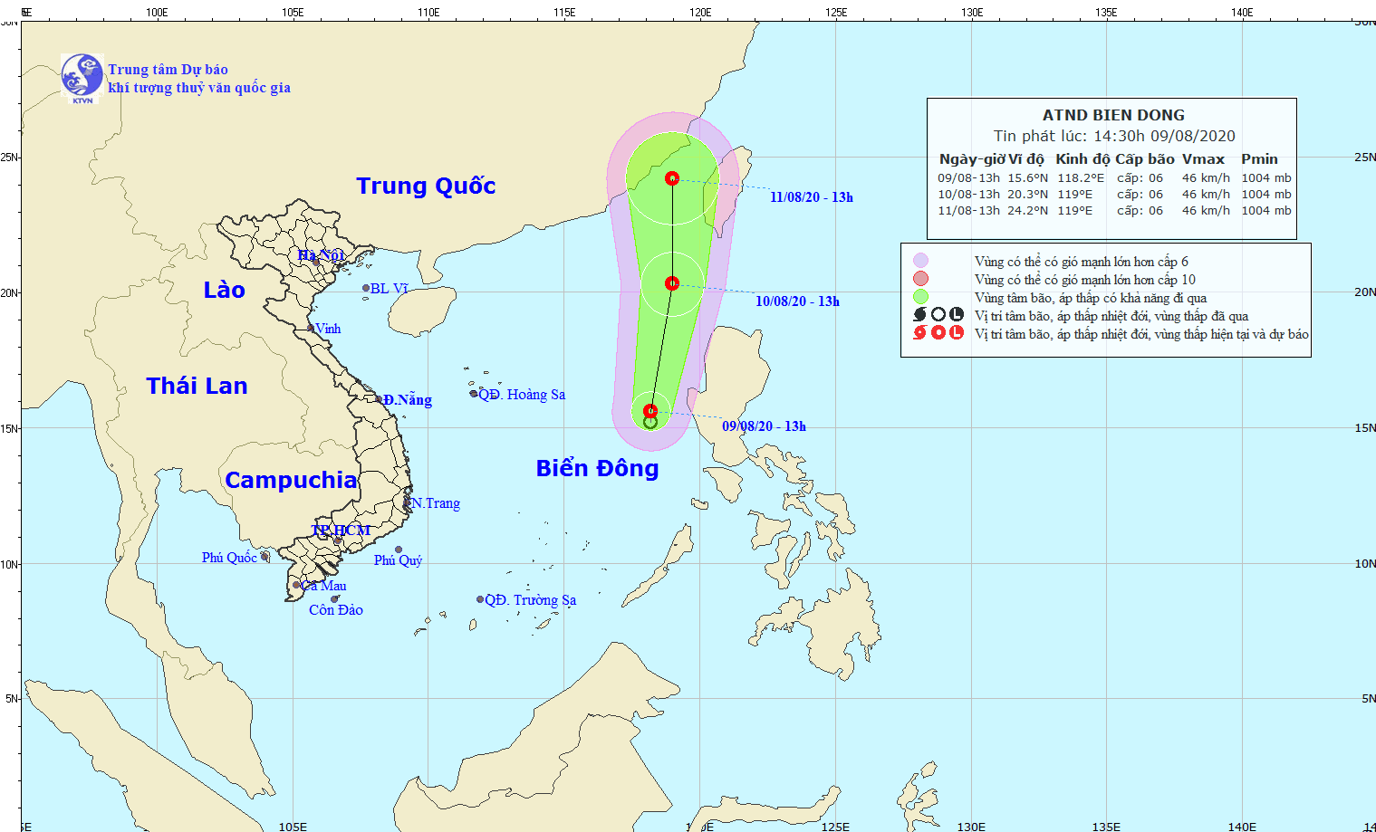 Trung tâm Dự báo khí tượng thủy văn quốc gia cho biết, hồi 13 giờ, vị trí tâm áp thấp nhiệt đới ở vào khoảng 15,6 độ Vĩ Bắc; 118,2 độ Kinh Đông, cách đảo Lu-dông (Phi-líp-pin) khoảng 200km về phía Tây. Sức gió mạnh nhất vùng gần tâm áp thấp nhiệt đới mạnh cấp 6 (40-50km/giờ), giật cấp 8. Bán kính gió mạnh từ cấp 6 trở lên khoảng 80km tính từ tâm áp thấp nhiệt đới.