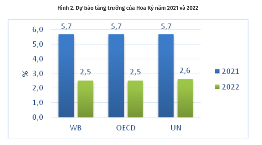 Điển hình, theo báo cáo Tình hình và triển vọng kinh tế thế giới của UNDESA, tăng trưởng của nền kinh tế Hoa Kỳ được dự báo sẽ giảm xuống còn 2,6% trong năm 2022, điều chỉnh giảm 0,9 điểm phần trăm so với dự báo đưa ra hồi tháng 01/2022, trong bối cảnh áp lực lạm phát cao, siết chặt chính sách tiền tệ và tác động trực tiếp cũng như gián tiếp của cuộc xung đột giữa Nga và U-crai-na.