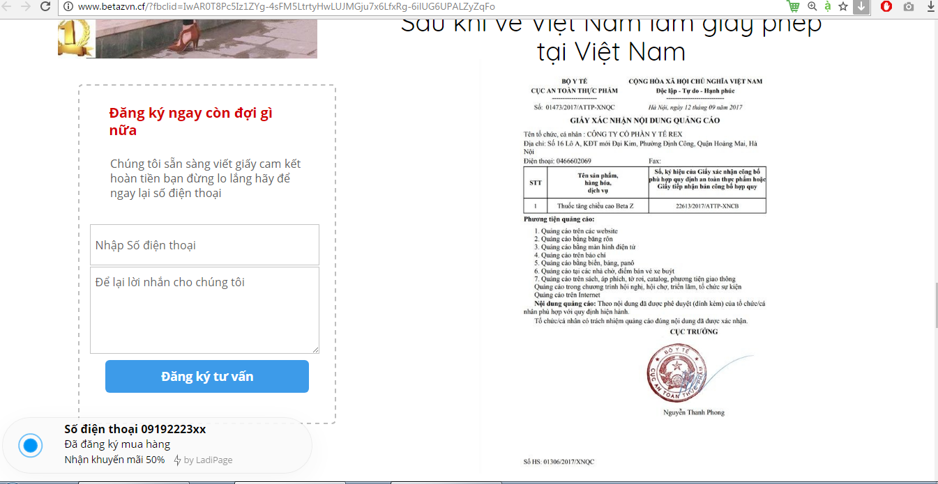 Trên website: http://www.betazvn.cf/ bán sản phẩm Beta Z cũng đăng tải một giấy xác nhận nội dung quảng cáo do Cục ATTP cấp cho sản phẩm mang tên “thuốc tăng chiều cao Beta Z”