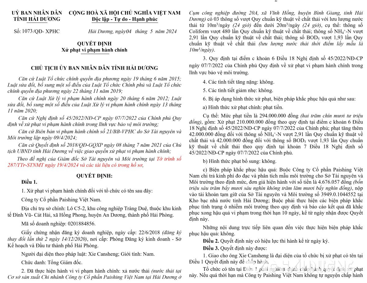 Trước những vi phạm trên, Chủ tịch UBND tỉnh Hải Dương ban hành Quyết định 1073/QĐ-XPHC xử phạt Công ty Cổ phần Paishing Việt Nam tổng số tiền 294 triệu đồng, theo quy định tại các khoản 6, 7 Điều 18 Nghị định số 45/2022/NĐ-CP ngày 7/7/2022 của Chính phủ.